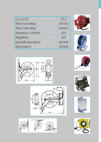 Innehåll Sida Vindor med slang 201-205 Vindor utan slang 206-208 Slangstopp & svirvlar 209 Väggfästen 210 Manuella slangvindor 211-213 Elkabelvindor 214-215