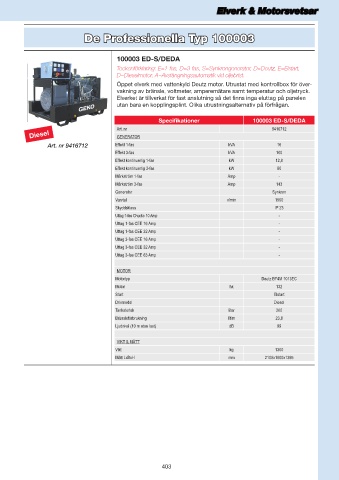 Teckenförklaring: E=1-fas, D=3-fas, S=Synkrongenerator, D=Deutz, E=Elstart,
