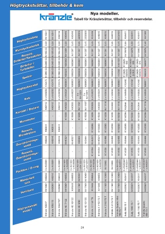 Tabell för Kränzletvättar, tillbehör och reservdelar.