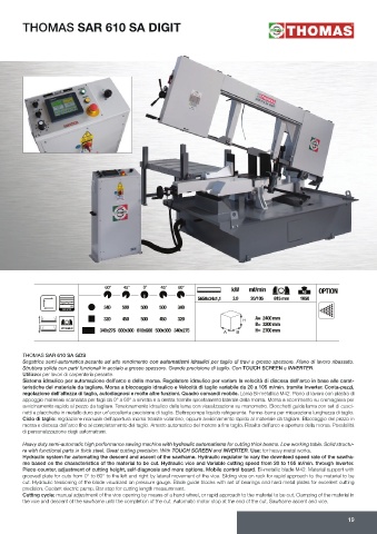 regolazione dell’altezza di taglio, autodiagnosi e molte altre funzioni. Quadro comandi mobile. Lama Bi-metallica M42. Piano di lavoro con piastra di