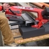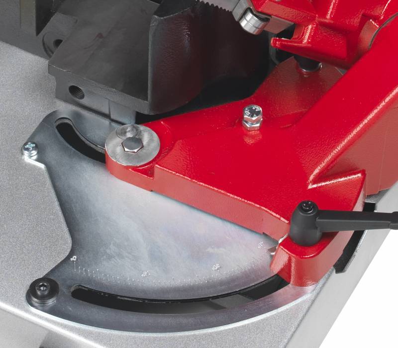 Lämplig att använda ute på arbetsplatsen tack vare att den är utrustad med hjul. Största kapacitet 213 mm. Kapningsvinkel kan justeras 0° till 45° vänster. Bladsträckning. Två hastigheter. Låsning av sågbygel. Går att använda med kylspray.