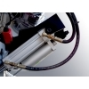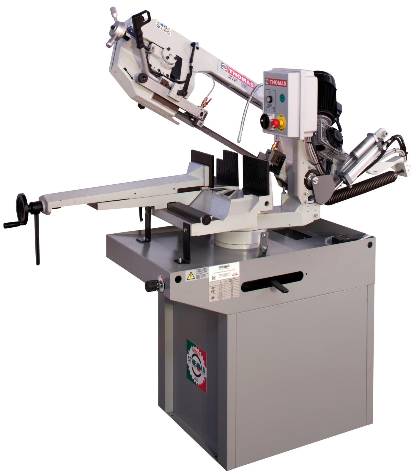 Bandsåg DA med hydraulisk kontrollerad nedmatning med ställbar hastighet för optimerad kapning. Genom att trycka "PUSH" på regulatorn för hydrauliken så startar sågningen och sågbygeln går ner. Genom att trycka "PULL" så stannar den, när sågningen är klar så stannar sågen och även kylpumpen automatiskt. Sågen gerar från 0° till 60° höger och 0° till 45° åt vänster. Växellådan går i oljebad. Sågramen och skruvstycket är i gjutjärn. Säkerhetsbrytare på bladskyddet och bladspänningen. Två hastigheter. Precisionsstyrning av bladet med hårdmetallklackar och justerbara lager.