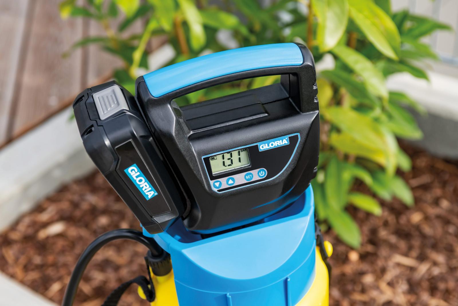 GLORIA-batteridriven pump gör det möjligt för trycksprutor att spruta kontinuerligt utan manuell pumpning i tryckområdet 1,5 – 2,5 bar. Måltrycket kan väljas i tiondelar av en sekund via ett förval på enheten. Detta upprätthålls automatiskt av pumpen under sprutning. Ett permanent konstant sprutmönster garanteras.