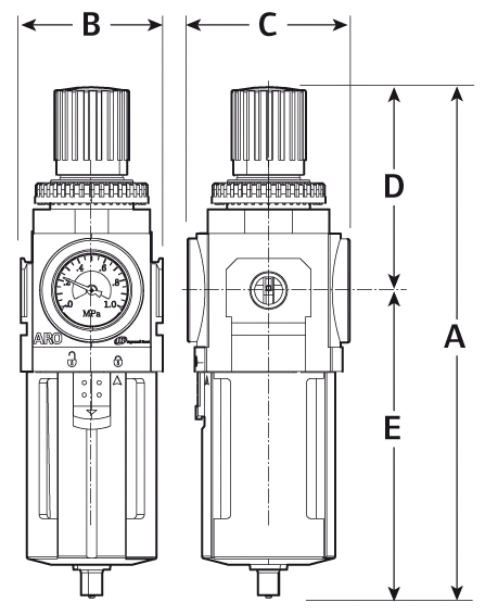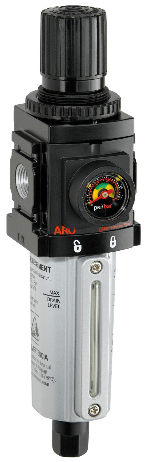 Filter-regulatorer eller ”piggybacks,” en kombination av både filter och regulator. ”Piggybacks” är kompakta och mest effektiva när utrymmet är trångt. Levereras som standard med 5 micron. Alla ARO-Flo regulatorer erbjuds med ett standard inställningsområde från 0 till 9,6 bar. Integrerad manometer. Metallbehållare. För olika fästen se tillbehör. Arbetstemperatur -5° till +60° C.
