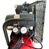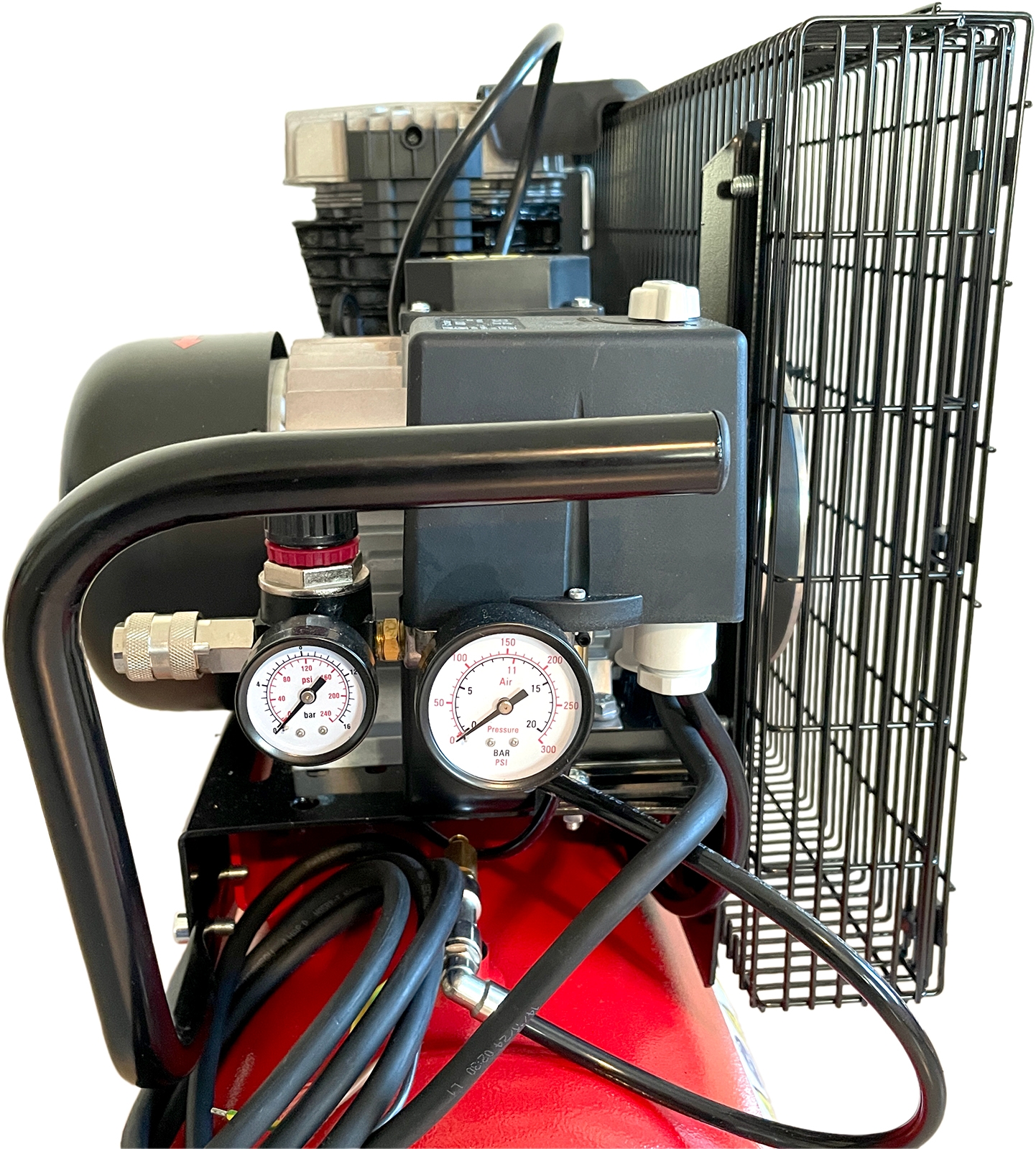 2-cylindrig, remdriven kompressor, där remskivan på kompressordelen har fläktvingar för bra kylning. Lågt varvtal. Kompressorn är utrustad med tryckströmbrytare, manometer, säkerhetsventil, reduceringsventil, snabbkoppling och hjul. Främre hjul är roterande och med broms. 3-fas handske ingår ej.