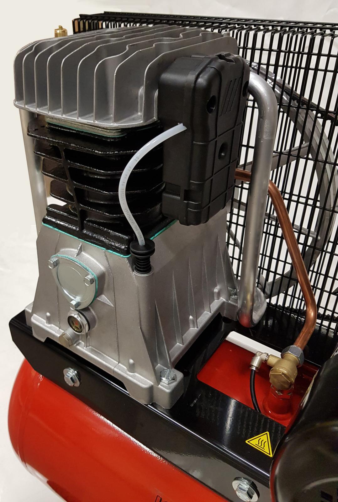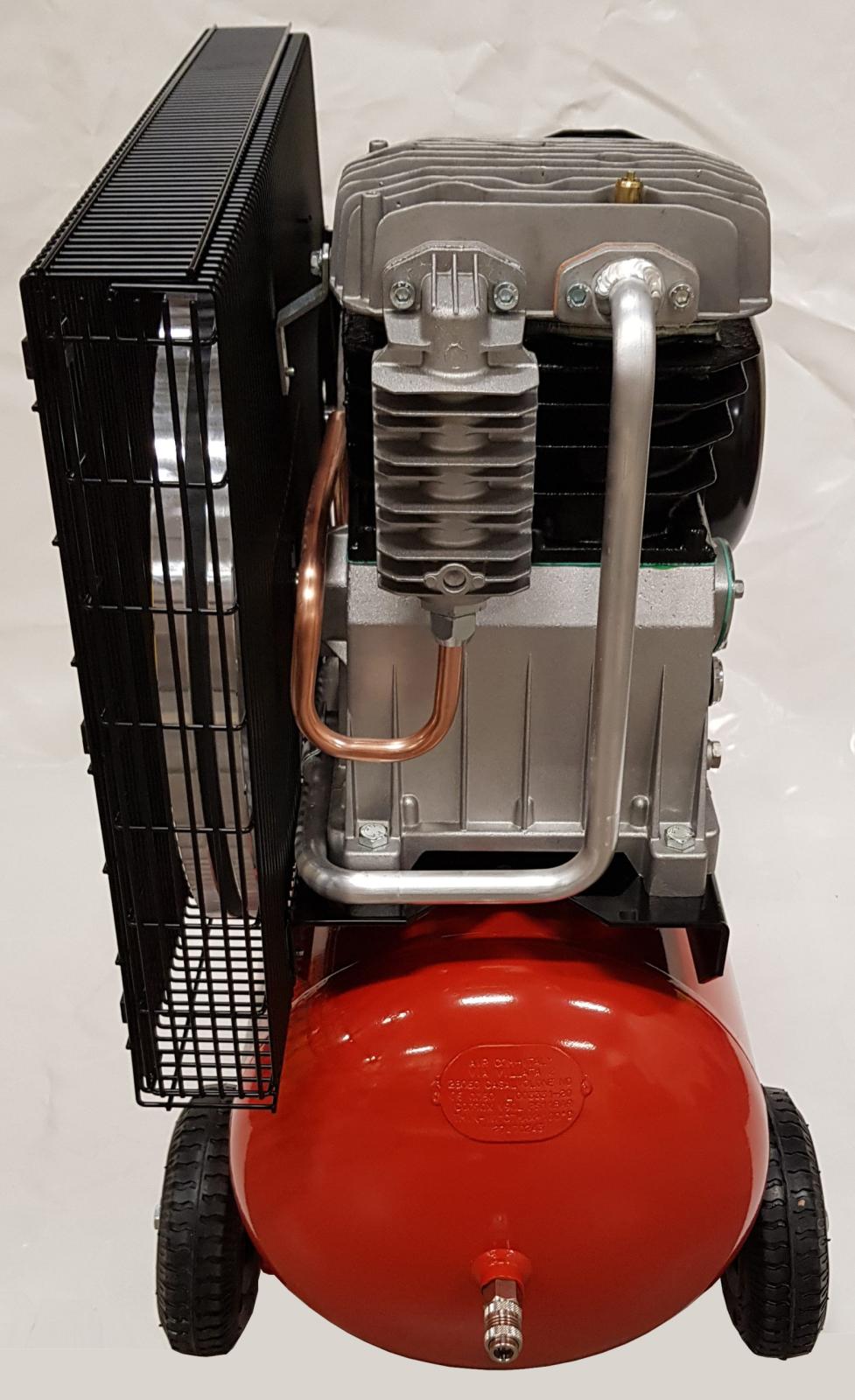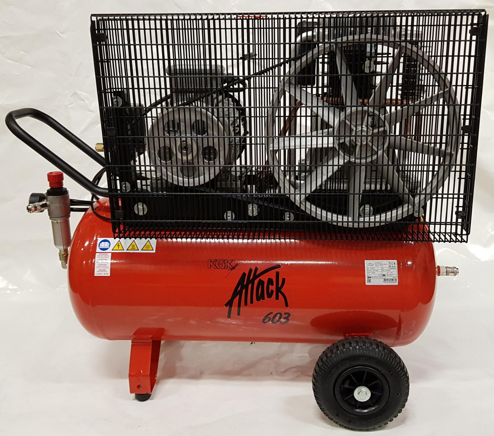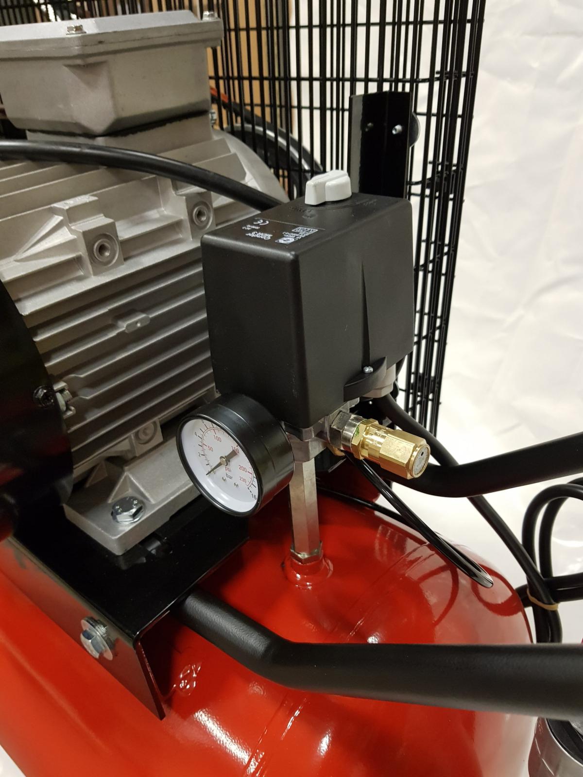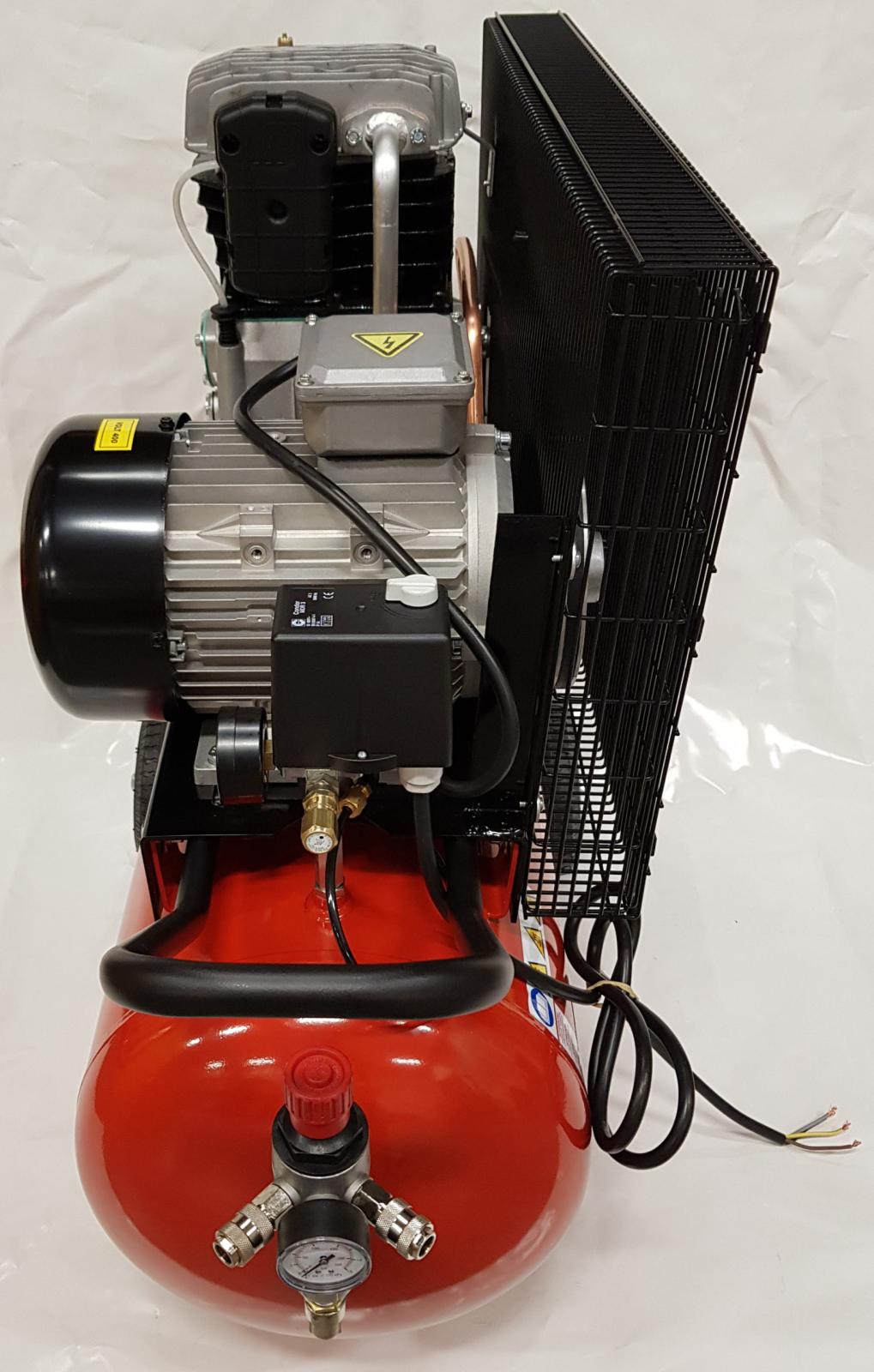 2-cylindrig, remdriven kompressor, där remskivan på kompressordelen har fläktvingar för bra kylning. Lågt varvtal. Kompressorn är utrustad med tryckströmbrytare, manometer, säkerhetsventil, reduceringsventil, snabbkoppling och hjul. 3-fas handske ingår ej.