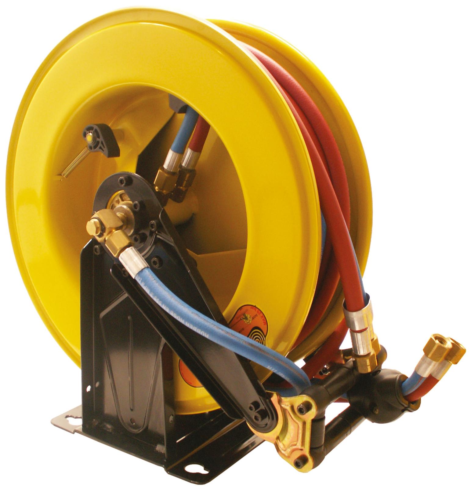 Komplett gasvinda, pulverlackerad med tvillingslang. Den öppna modellen ger bra kontroll på hur slangen vindas upp. Armarna till utloppet kan ställas i tre olika lägen.