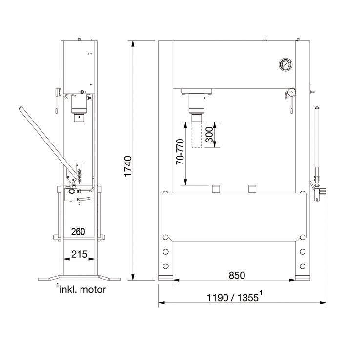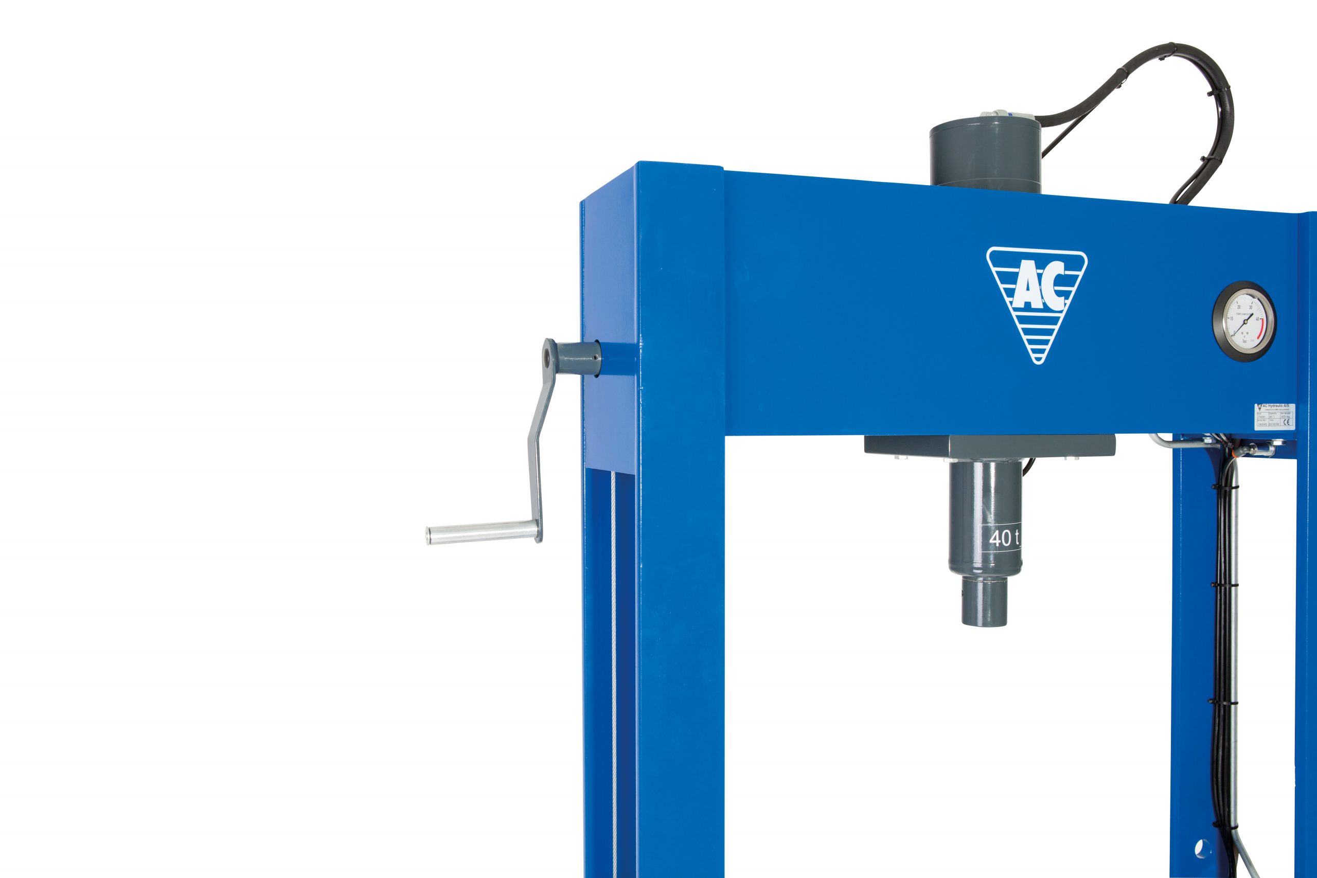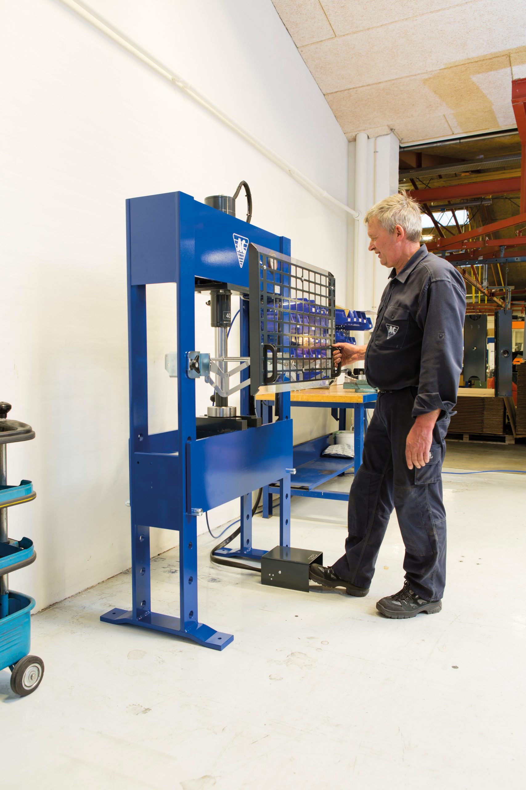 Elhydraulisk 1-stegs pump (Presshastighet: 6,1 mm/s). Steglös inställning av presstryck. Dubbelverkande och sidledes flyttbar cylinder. Stor slaglängd på 300 mm. Inbyggd manometer i ögonhöjd. Helsvetsad ram och pressbord. Vinschmanövrerat pressbord. Inbyggd säkerhetsventil. Avtagbar trycksko för montering av olika pressdon. Motor på 3 x 400V och 50 / 60 Hz (kan omkopplas till 3 x 230V). Inkl. 2 riktstäd.